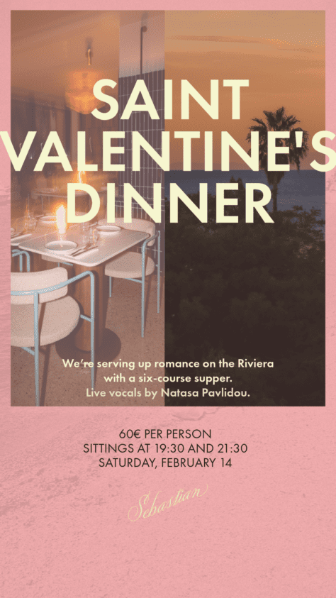 This Valentine’s Day, Sebastian in the Athenian Riviera invites you to celebrate love in style and savour exceptional food in an elegant setting in Glyfada. Join us with someone special on Saturday, 14 February, and indulge in an intimate 6-course dinner experience, starting with a welcome glass of bubbly and accompanied by live music by Natasha Pavlidou and