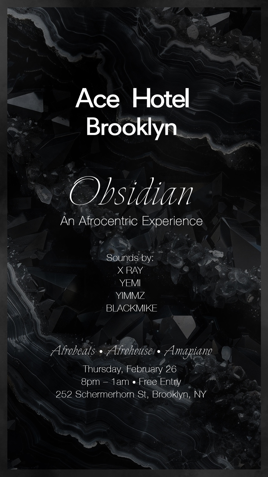 Obsidian is a sound experience rooted in rhythm, culture, and movement. The series brings together Afrobeats, Amapiano, house, and global diasporic sounds to create an atmosphere that feels both elevated and deeply communal. Designed as more than just a party, Obsidian is a space where music, identity, and connection meet -intentional energy, refined sound, unforgettable nights.